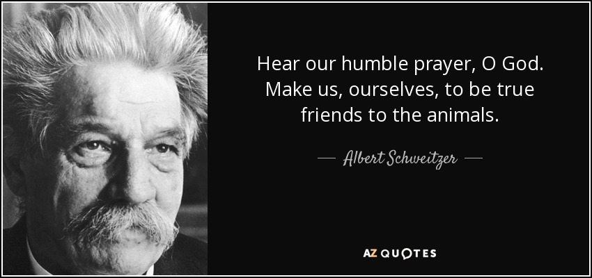 Albert Scheitzer wrote a prayer that I’ll share with you. “Hear our humble prayer, O God, for our friends the animals, especially for animals who are suffering, for any that are lost, or deserted or frightened or hungry; for all that must be put to death. We entreat them all thy mercy…and for those who deal with them we ask a heart of compassion and gentle hands and kindly words.”